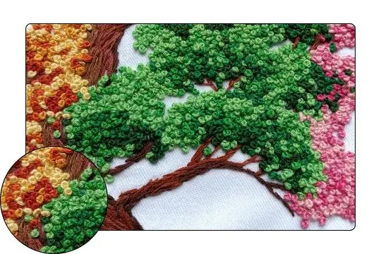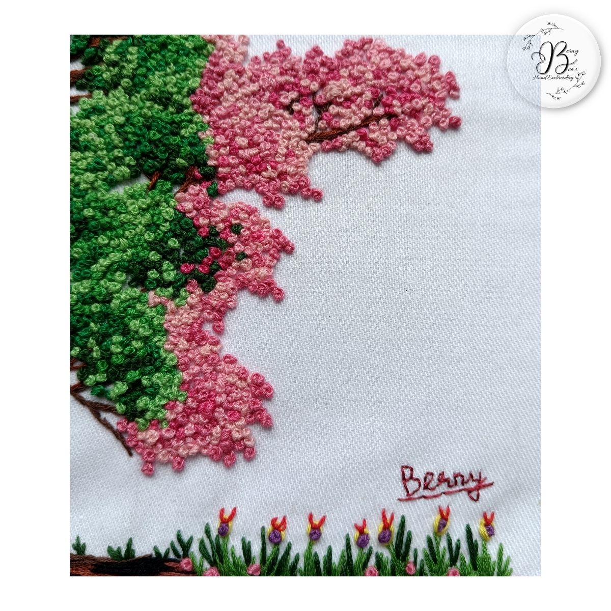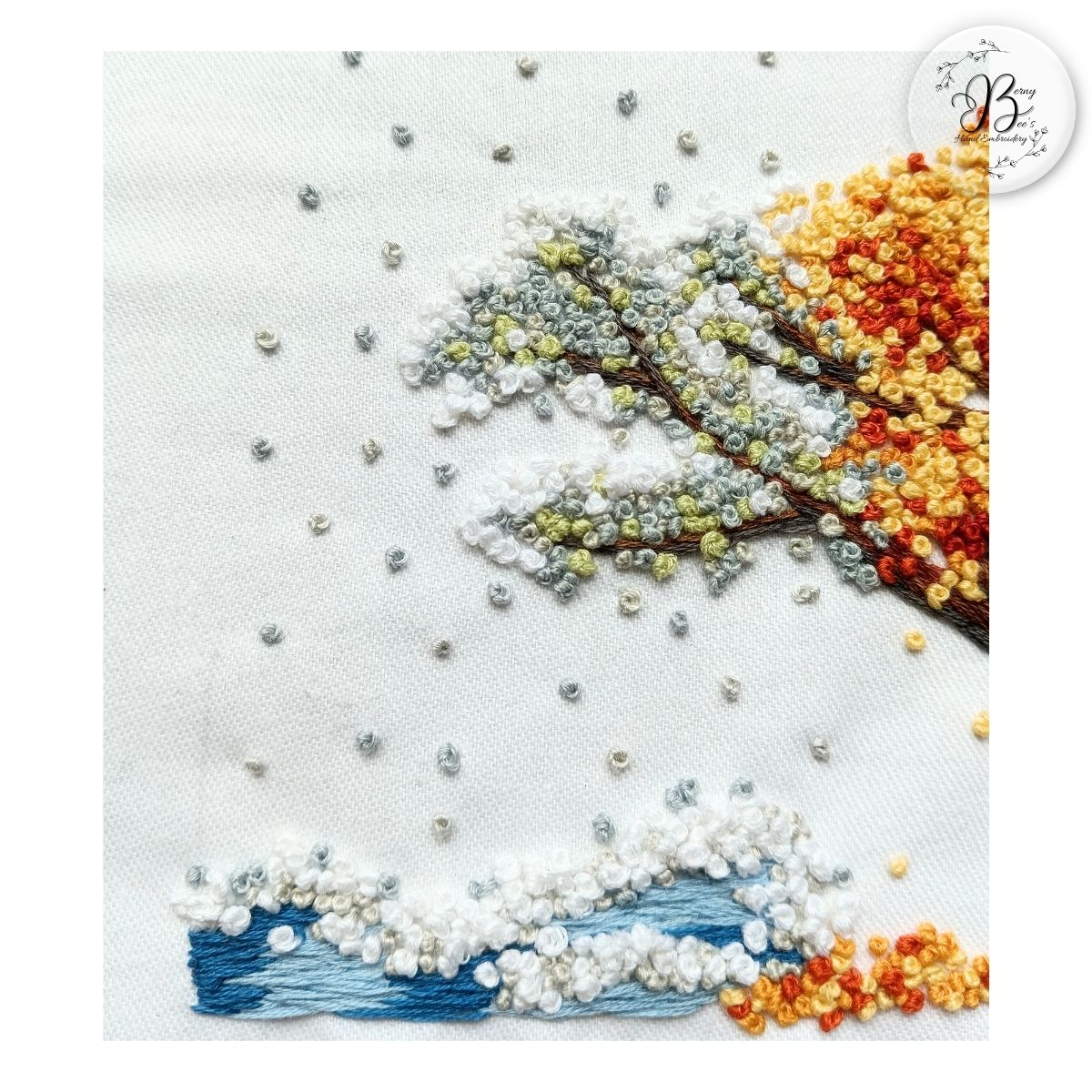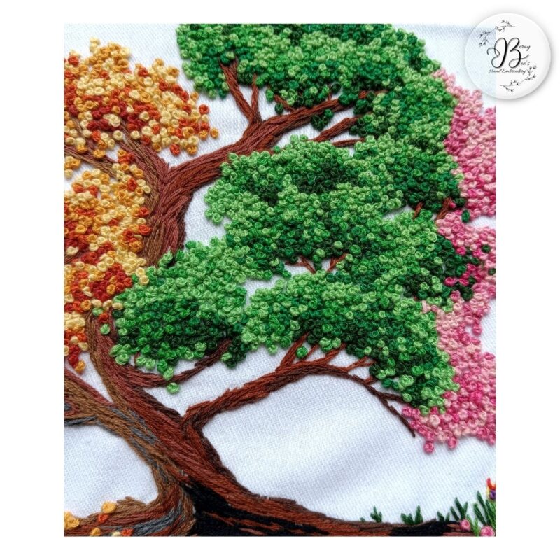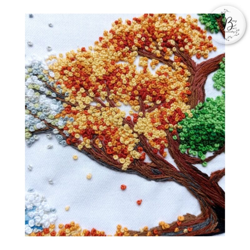 Each section of the design is stitched slowly and intentionally, layering threads to create subtle colour transitions, depth, and texture. The tree, branches, and seasonal details are formed using thread painting techniques that allow the artwork to feel almost like a painting made with thread.
