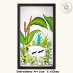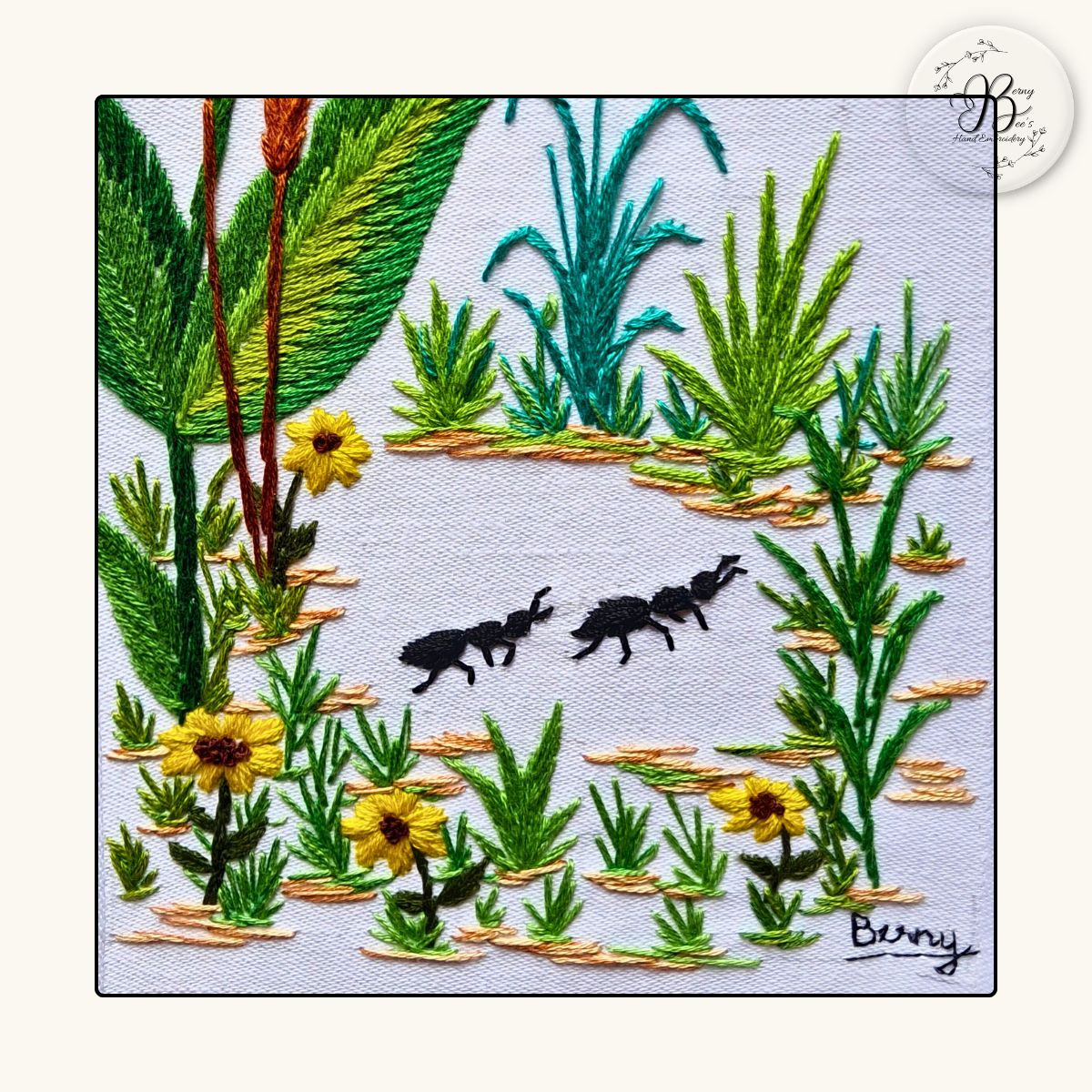 The first artwork in The Ant Split-Image Series, A Lesson in Purpose captures two ants marching across sandy soil surrounded by tall grasses and golden flowers. Hand embroidered by BernyBee, this textile artwork reflects diligence, determination, and the quiet wisdom found in nature.
